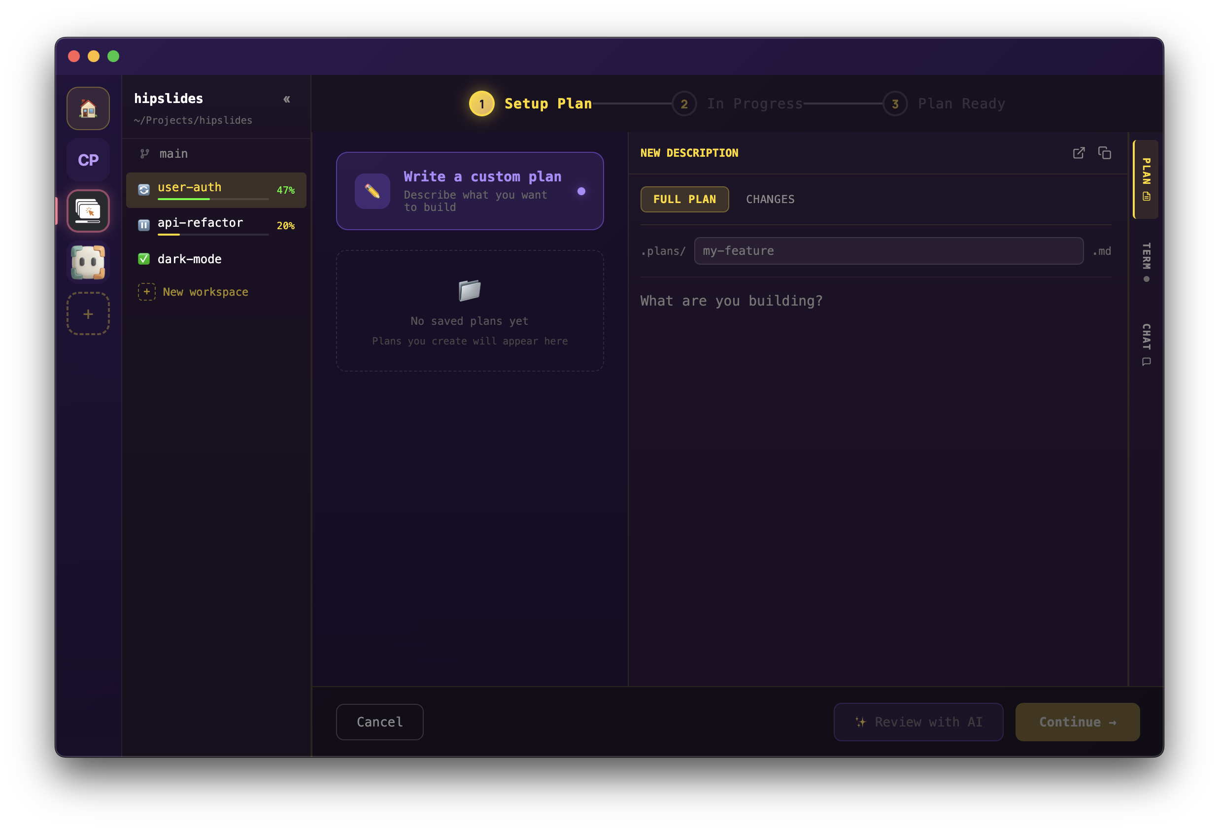 Write what you want to build in plain English. Describe the feature, the requirements, and any specific details. Ralpher will turn your plan into actionable stories.